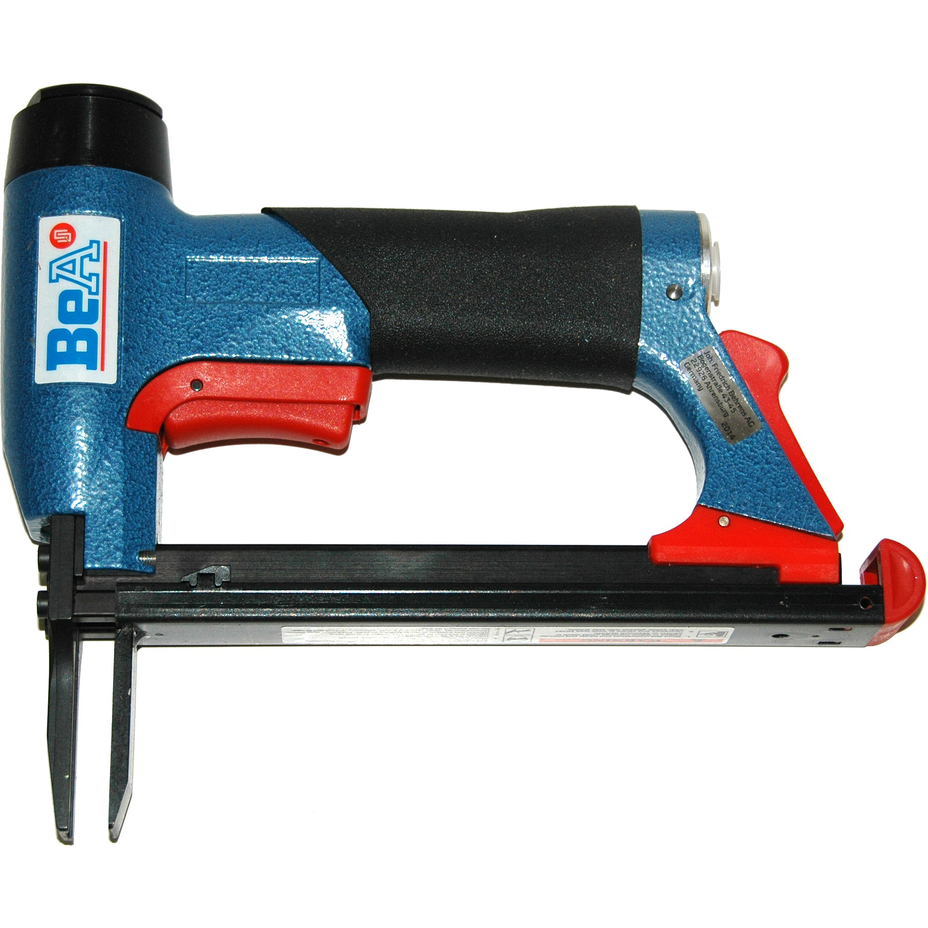 This staple gun is made in Germany & is considered to be a superior air gun. The 2″ nose is useful when stapling grooves. It takes a #7 series staple.
