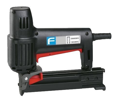 This electric staple gun has a safe interlocking trigger & a built in pusher. It is rear loading and has a 12′ extension cord.
