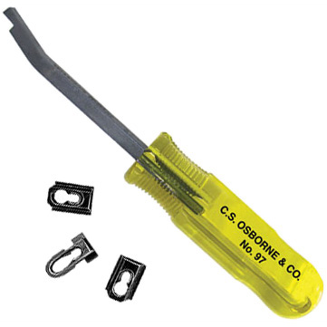 Installs and removes the plastic clips that hold molding strips. Press down and slide the clip on or off. This tool helps avoid scratches on new finishes, as well as injury to the worker’s hand.