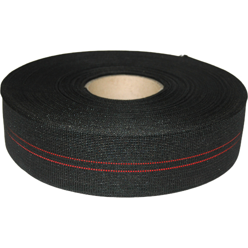This 2″ woven rubber webbing is black with a red stripe.